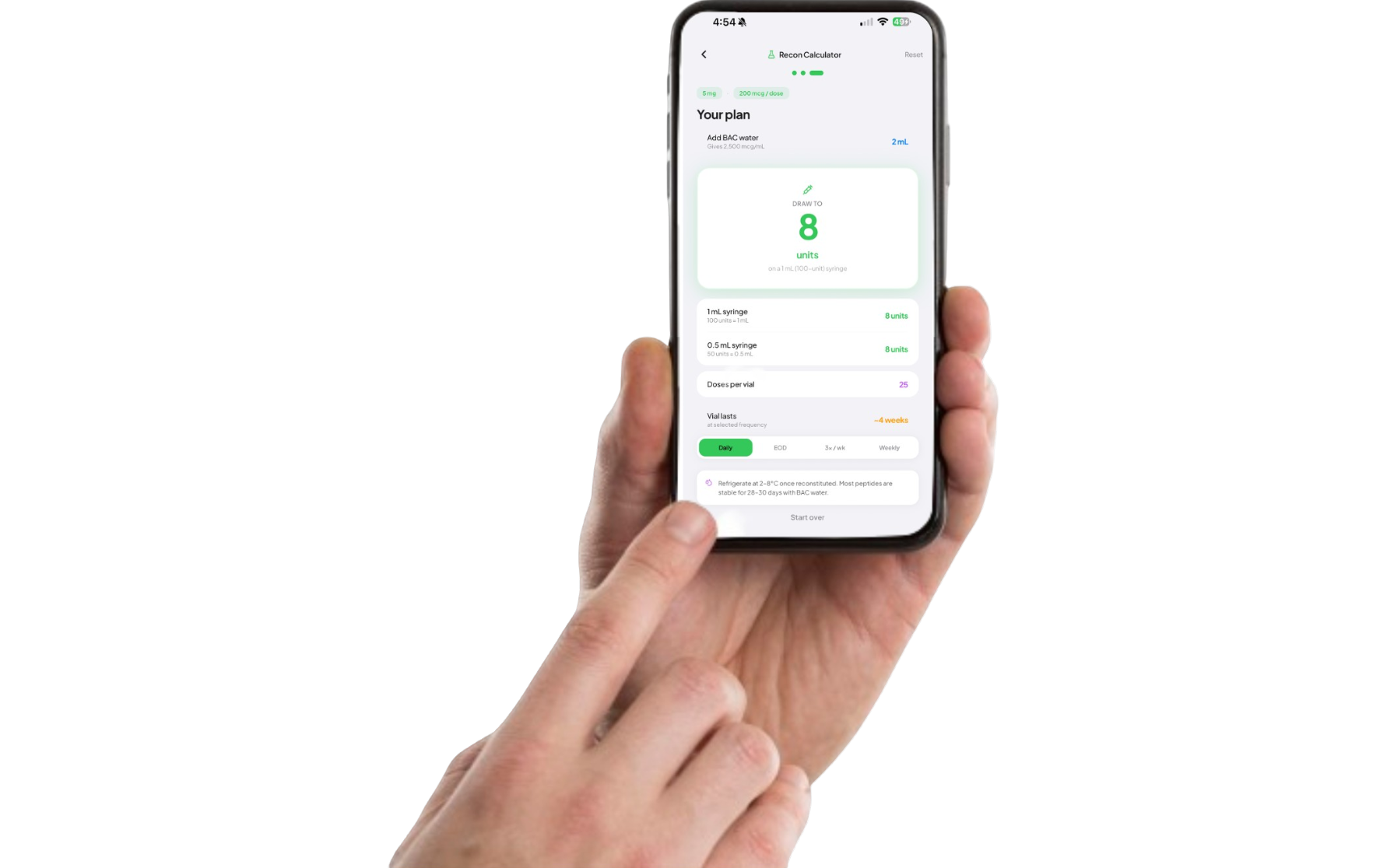 Never guess your mixing math again. Input vial size and desired dose — Vial calculates exactly how much BAC water to add and units to draw.